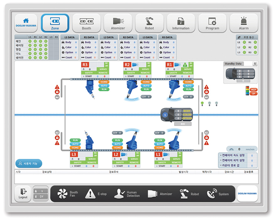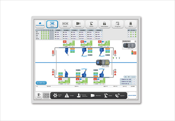 | 로봇 / 존 모니터링 | - 도장 및 실링 부스 상황을 실시간 모니터링 할 수 있으며, 로봇과 도장 모듈을 제어할 수 있습니다 |